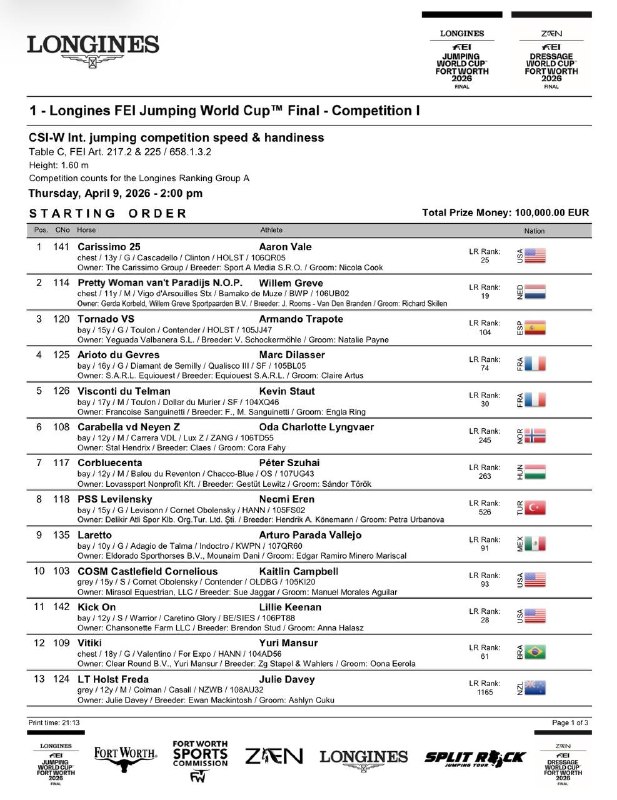 🐎🇺🇿 Bekzod Kurbanov “Jahon kubogi finali”da (AQSH, Texas🇺🇸) 7–12-aprel kunlari AQShning Texas shtati, Fort-Uert shahrida ot sportining to‘siqlardan sakrash (konkur) yo‘nalishi bo‘yicha Jahon kubogi finali